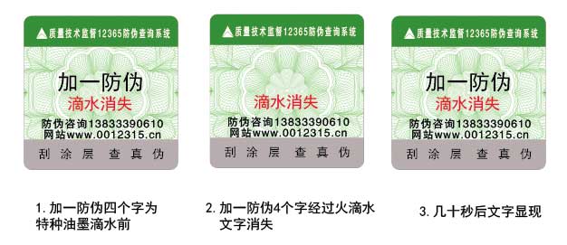 滴水消失同火烤消失都是特種防偽油墨,利用油墨的物理特性防偽